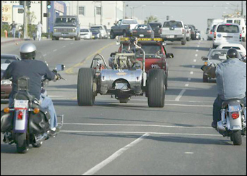 December 16, 2003 - INTERVIEW - Randy Grubb, Semi-Truck Chopper One day Randy Grubb stopped by West Coast Choppers and showed Jesse a picture of the car he'd built and subsequently sold to Jay Leno: a 22.5-foot-long, 8,500-pound, open-wheeled roadster called the Blastolene Special. Who would have guessed that Monster Garage would have a Peterbilt build in mind at the time? But it was only months later that Randy was flying out to Long Beach to shoot Semi-Truck Chopper. Now he tells us about the experience. Q: How did you get on Monster Garage? A: I built a very large car, the Blastolene Special, which created quite a stir because of its scale and uniqueness, including its 1,800-cubic-inch engine. When I happened to come down to West Coast Choppers, I showed Jesse a poster of the car and introduced myself. At that point, he said that they were thinking of doing a Peterbilt build, and that I'd be perfect for it. A few months later the phone rang with a producer asking me if I'd like to participate in a Monster Garage episode. And that's when I basically proposed the whole Blastolene Brothers build team. Because the brotherhood is about creativity and having fun. Editor's note: Apply to be on the show yourself by clicking here. Q: What have you thought of past Monster challenges? A: They've ranged from what's appeared to be technically very challenging to what's appeared to be pretty silly. For example, the Cop Car/Doughnut Shop was definitely good for a laugh, but that wasn't really something I would have been interested in building myself. I like the Zamboni - I didn't know how they were going to pull off that Zamboni. It really made me think when I heard the introduction to that show, and I liked that. Q: What was your initial reaction when you heard about this challenge? A: I was really excited, and I guess it was a little unusual because I was on both the design team and the build team. Most of the time a build-team member doesn't know what he's building until he shows up. But I knew in advance. After my very first conversation with the producers about the show, the wheels really started turning in my head about what we could build and how we could build it. This was both an advantage and a disadvantage, because I expended a lot of mental energy toward designs that we didn't execute. It was very interesting and the challenge was obvious. And it was a unique challenge, which is what I love. Q: Did you know any of your teammates before the show? A: Yes, two. I got Michael Leeds, the other Blastolene Brother, involved. And I had met Bernard, who is Jay Leno's mechanic, when I sold the Blastolene Special to Jay. I was amazed at Bernard's broad knowledge of mechanics and his willingness to apply them. Jay obviously has a lot of unique vehicles, and Bernard's the one who handles all that. So when Bernard was confirmed for the show, I breathed a sigh of relief because I knew the project would go well. I had also requested a diesel mechanic and machinist for the team, and recommended two people. The producers didn't want a group who had done too much together before, though, so they supplied them. Both were great guys. Bob brought a great Texas flavor to him, and Danno, a machinist from Hollywood, definitely earned his keep. We kept him busy. Q: What was the biggest technical challenge during the transition? Were you ever worried your team would fail its mission? A: The front end - the steering and mounting of the front wheel. There were a lot of design changes and a lot of thoughts about the design. A lot of mental effort was expended on that front end. And the final solution was great because it really utilized the truck parts, including a piece of the front axle and the steering box. Failure is an impossibility to a Blastolene Brother. It was merely what design would be executed - that was the only challenge. We had three or four different options for the front end; we just had to choose one. Q: Anything else remarkable about the shoot? A: Just how fun it was and how smoothly it went. The team was a cohesive team; we had no dissension among the troops. Everyone got along very well and worked effectively together, which is generally not the case in a Monster Garage build from what I've seen. Generally there seems to be conflict or someone not pulling their weight, which puts a strain on the group as a whole. For us, on Monday we had a big mountain to climb. But by Friday it seemed like we were over the top pretty easily. Q: What was your biggest frustration during the build? A: The biggest frustration was getting parts from Alex and dealing with some of the supply issues. If it hadn't been for Michael stepping up and taking the reins as far as supply goes, we would have been in trouble. Michael got on the phone and got the wheels and tires, the most exciting crucial elements. Alex was little to no help. Sorry, Alex. Q: What was your biggest triumph during the build? A: I would say the biggest triumph was probably getting Jesse on the same page that it had to be a three-wheeler. He was originally wanting a two-wheeler, and the weight of the motor and transmission really made that an impracticality. Q: Did you drive the monster? A: Yeah, Jesse let me drive it! It was a lot funner than I ever thought. In fact, the Blastolene Brothers were deeply influenced by this whole experience - diesel trucks are in the workshop as we speak. Q: What are the Blastolene Brothers? A: Michael and I, the Blastolene Brothers, are individual artists who historically have worked with glass and more recently have applied our art to the automobile. The result are V-12-powered monster hot rods featuring 1,000-cubic-inch-plus V-12 motors and semi-truck parts as drive train. The Blastolene Special and Michael's Big Bertha have created a new category of hot rods. Basically we're both dyed-in-the-wool motorheads. For example, my dad brought home a Model A when I was 8, and taught me to weld when I was 10. I started buildi