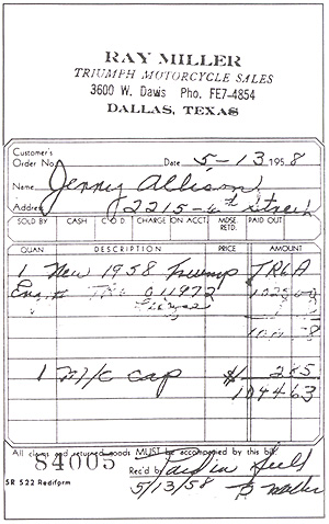 Joe B. decided on a Triumph Thunderbird, all the latest 1958 models.